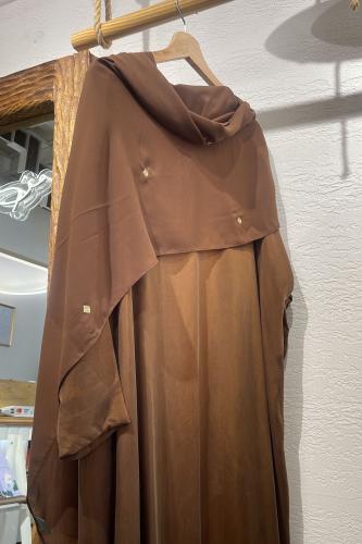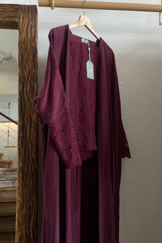 عباية مخمل منسدل بتطريز بشت فضي - وردي غامق