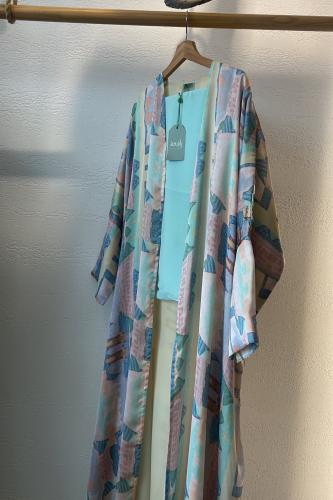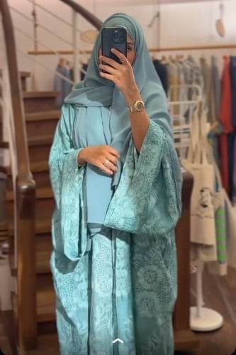 عباية حرير كوبرو بتطريز ورد قيطان فيروزي