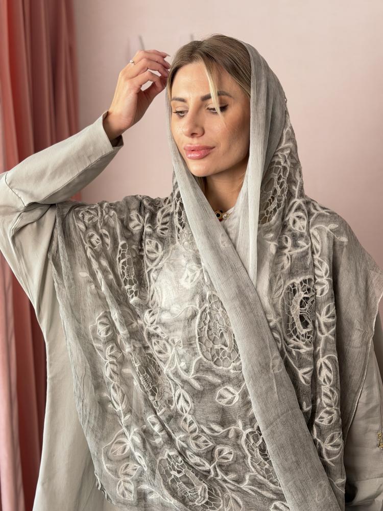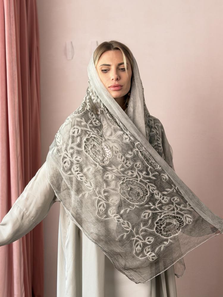 عباية كوبرو طرحة مطرزة ورد - رمادي فاتح