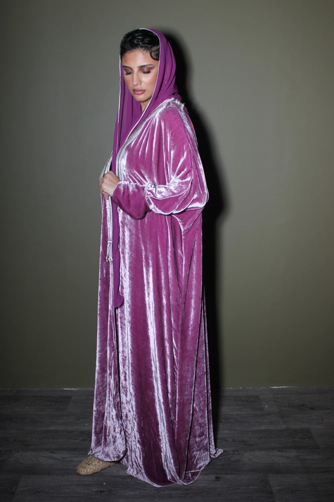 عباية مخمل منسدل بتطريز بشت فضي - وردي غامق