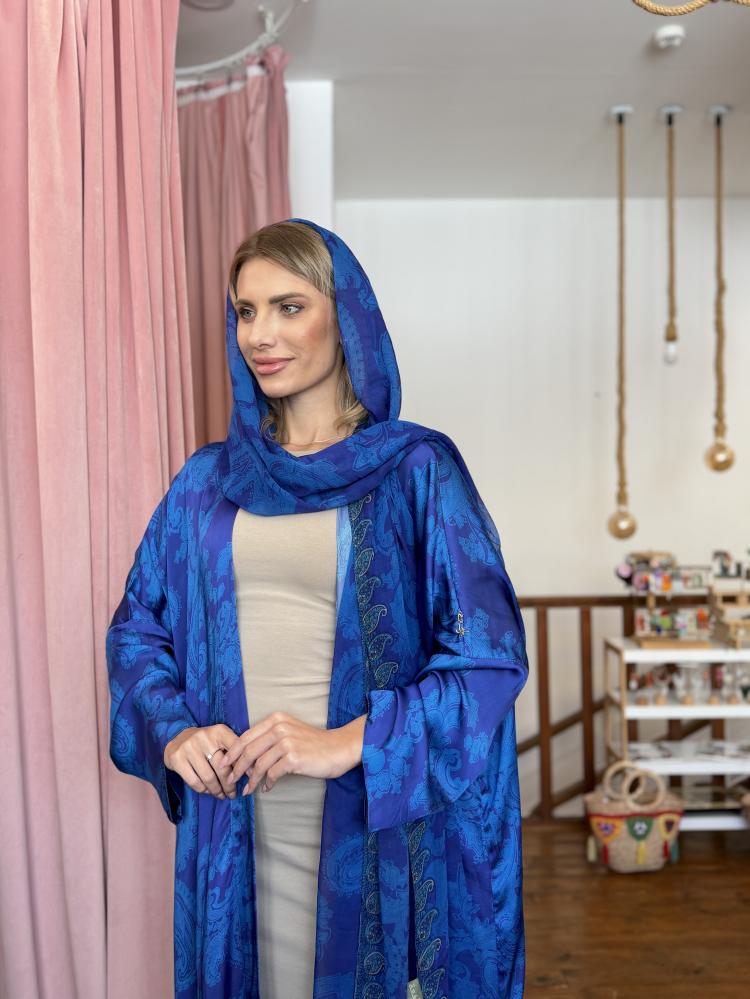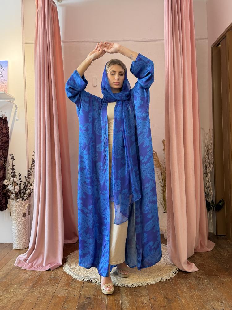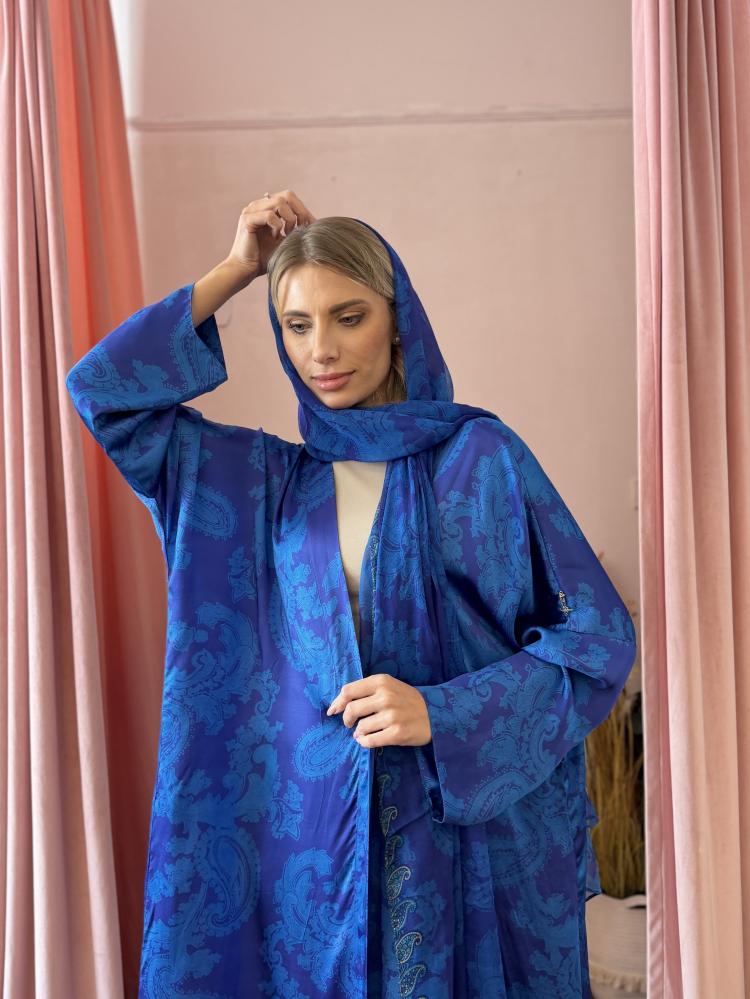 عباية وطرحة حرير طبيعي مشجر - أزرق نيلي