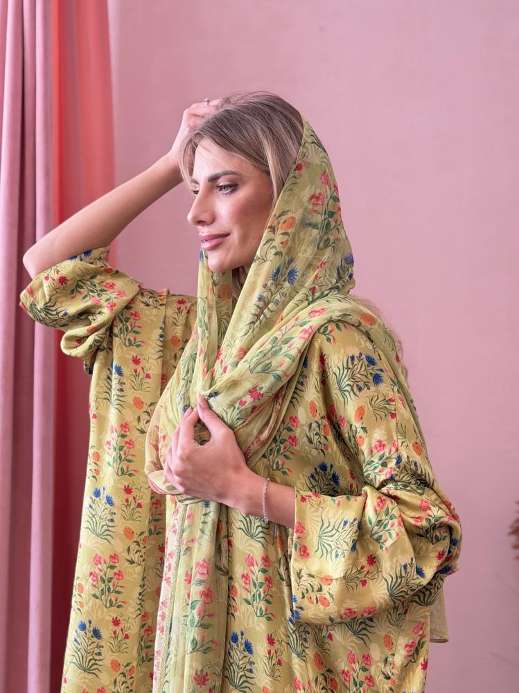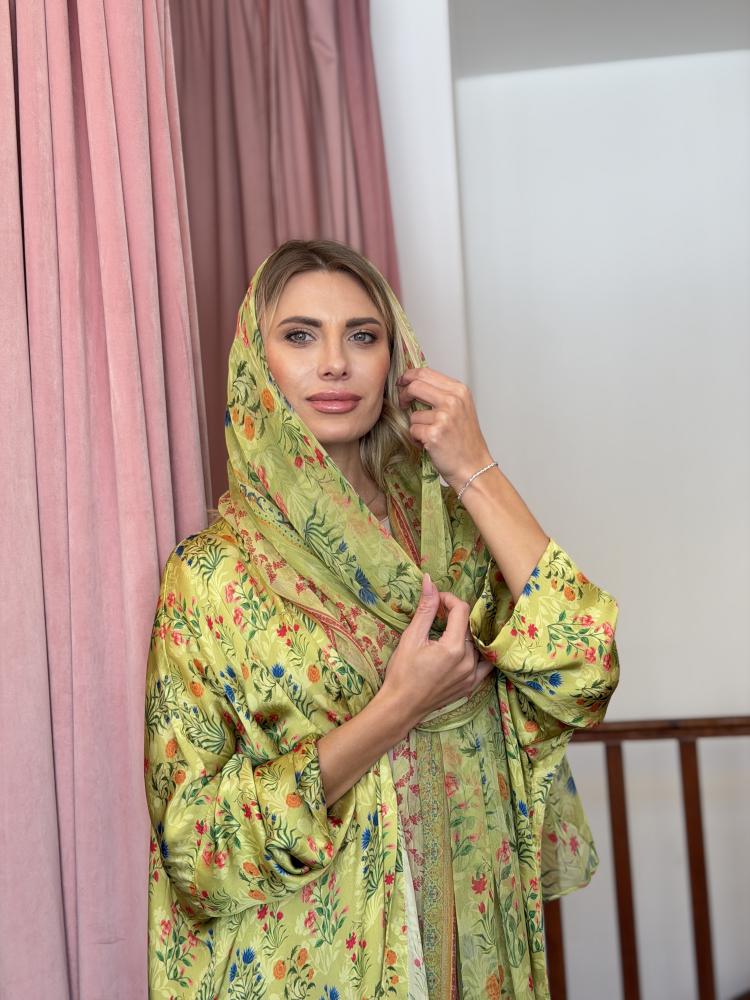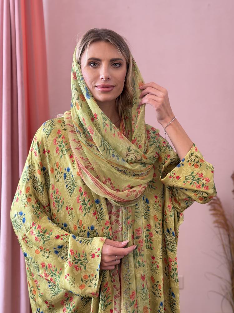 عباية وطرحة حرير طبيعي مشجر - فستقي